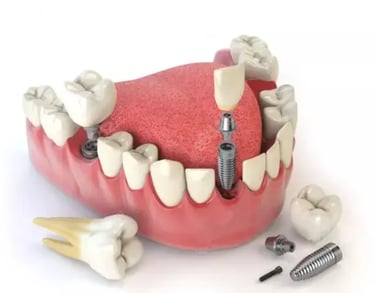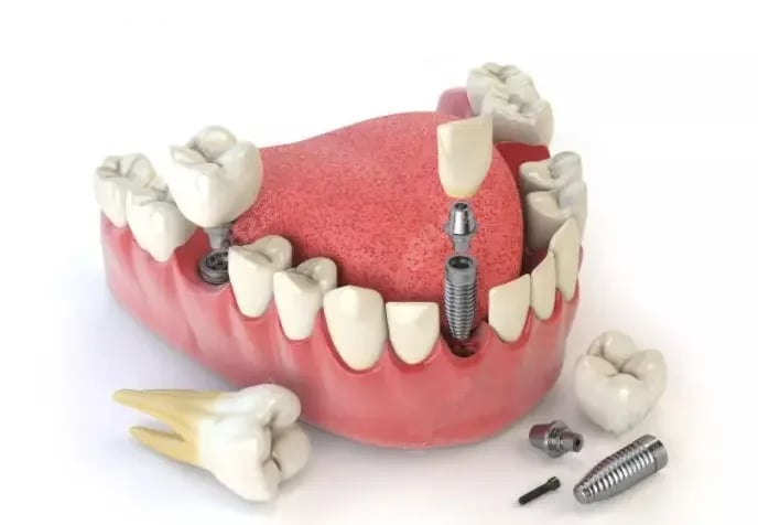 Dental implants are composed of 2 major parts, the post, and the artificial tooth. The post is surgically placed into the jaw. The bone bonds with the post creating a foundation for the artificial tooth to be placed. In addition to restoring the ability to eat, dental implants also help prevent bone deterioration that occurs with missing teeth.